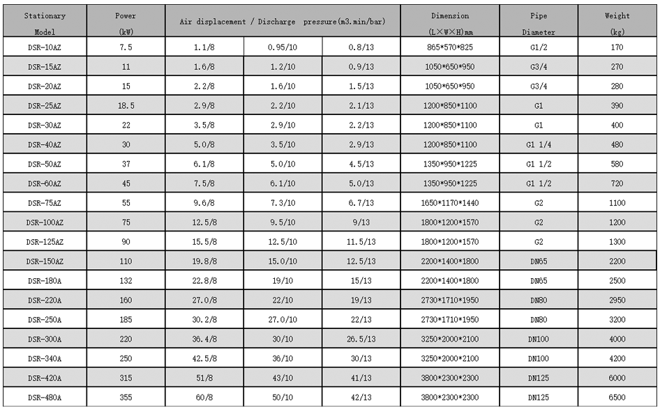 ◆ Voltage: 380V/50HZ. 7.5A、10A are direct startup, above 15A is star triangle start ◆ Other pressure (up to 16bar) screw air compressor, welcome to negotiate ◆ The company continuously improves the products and retains the right to change the design.Parameters are subject to change without prior notice ◆ A after the model represents air cooling and W represents water cooling