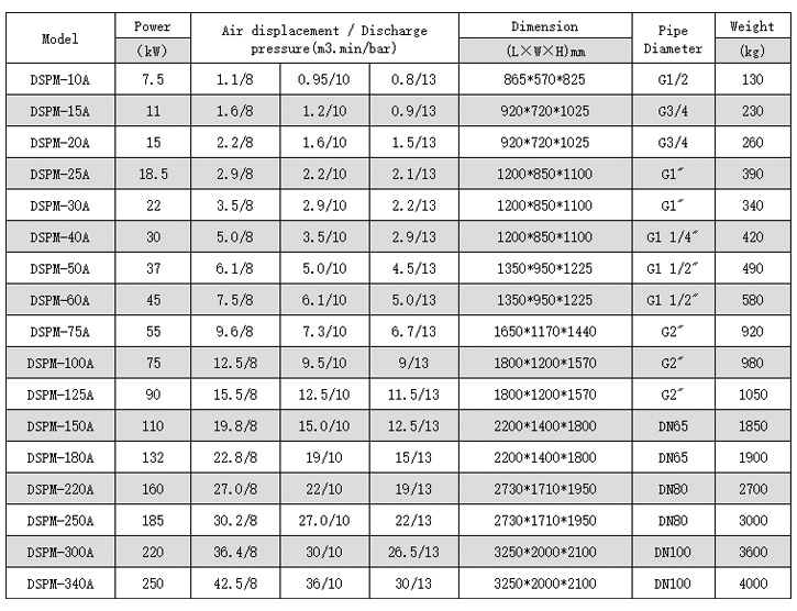 Technical parameters of of PM VSD screw air compressor